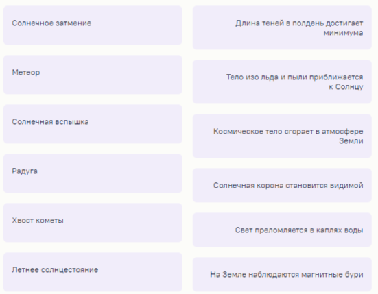 Ответ: Луна → Самый близкий к Солнцу естественный спутник планеты, Млечный Путь → Имеет бар и спиральные рукава, Титан → Имеет атмосферу из азота и метана, Европа → Обращается вокруг крупнейшей планеты в Солнечной системе (Юпитера)