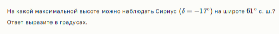 Задание 6. На какой максимальной высоте можно наблюдать Сириус (δ=−17∘) на широте 61∘ с. ш.? Ответ выразите в градусах.