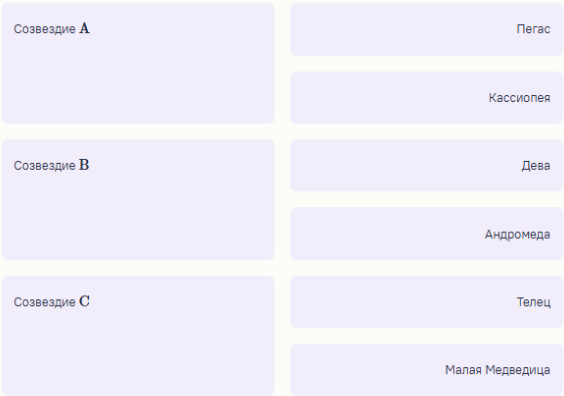 Задание 6. Созвездия A, B и C находятся в Северном полушарии небесной сферы. Созвездия A и C граничат друг с другом и в России лучше всего видны в августе‑октябре. В созвездии A находится известная галактика, видимая невооружённым глазом и носящая то же имя, что и само созвездие — имя царевны из древнегреческого мифа о Персее. Созвездие C в древности называли Конём. Созвездие B имеет неподвижную точку, расположение которой относительно горизонта при наблюдении из одного и того же места всегда одинаково.