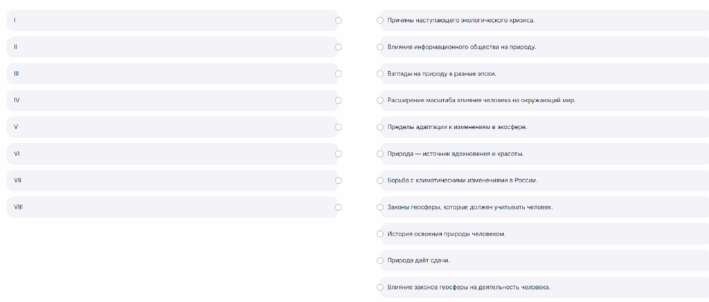 (III) Чем больше мы воздействуем на природу, тем активнее она нам отвечает. И в большинстве случаев ответ оказывается весьма далёким от благоприятного: ухудшается экологическая ситуация, всё чаще происходят природные катастрофы. Судьба дальнейшего развития человечества зависит от того, насколько быстро будут найдены пути разрешения противоречий между ограниченными возможностями нашей биосферы и агрессивным по отношению к ней типом развития общества. (IV) В разное время и в разных культурах понятие роли и значимости окружающего мира для человека существенно отличалось. В период античности природа рассматривалась как подвижное, постоянно изменяющееся целое, при этом закономерное, организованное и совершенное. Человек в античной философии не противопоставлялся природе, а скорее был одной из его частей. Однако средневековая культура приобрела совершенно другое понимание природы. Человек стал восприниматься как вершина творения, наделённая душой, а весь окружающий мир стоит неизмеримо ниже него.