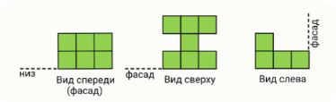 Задание 7. Из одинаковых кубиков сложили конструкцию. На рисунке представлен её вид спереди, сверху и слева.