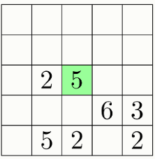 В каждой части в одной из клеток написали количество клеток в этом фрагменте. Отметьте на изображении все клетки фрагмента, содержащего выделенную зелёным клетку.