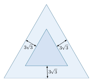 Задание 3. Два равносторонних треугольника с параллельными сторонами расположены так, как показано на рисунке. Оказалось, что расстояния между параллельными сторонами треугольников равны 3√3. Найдите разность периметров этих треугольников.